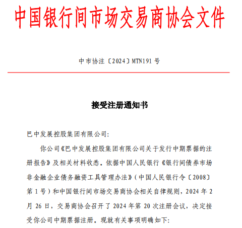 2月28日,巴中發(fā)展控股集團成功獲得中國銀行間市場交易商協(xié)會出具中期票據(jù)注冊的批文(中市協(xié)注〔2024〕MTN191號),注冊金額20億元,批文有效期2年,這是巴中發(fā)展控股集團獲評AA+主體信用等級以來又一重大突破。下一步,巴中發(fā)展集團將密切關注資本市場行情擇機擇期發(fā)行,爭取獲得低利率發(fā)行成本,實現(xiàn)債券首發(fā)成功。